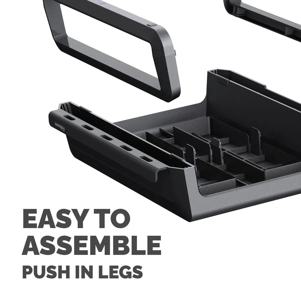 The Breyta monitor riser also features a handy device channel for storing your mobile devices and routing charging cables, keeping your desk clutter-free. Capable of supporting monitors up to 15 kg, this stand is made from 100% recyclable materials, ensuring durability and environmental responsibility. The Breyta monitor riser combines comfort, style, and sustainability to elevate your productivity and well-being.