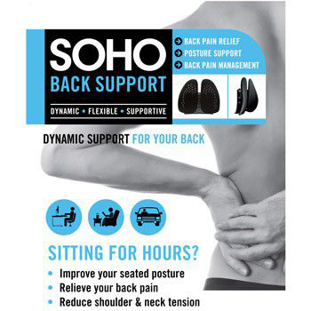 The Soho Back Support is designed to encourage an ergonomic spinal posture and provide comfort. It is lightweight, portable and provides dynamic support for the spine and surrounding joints. The unique design allows the 2 flexible plates to conform to the shape of your spine and encourage movement, prevent back problems and relieve back pain whilst in the seated position.