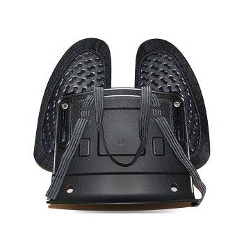 - Fastens to a seat with an adjustable strap
